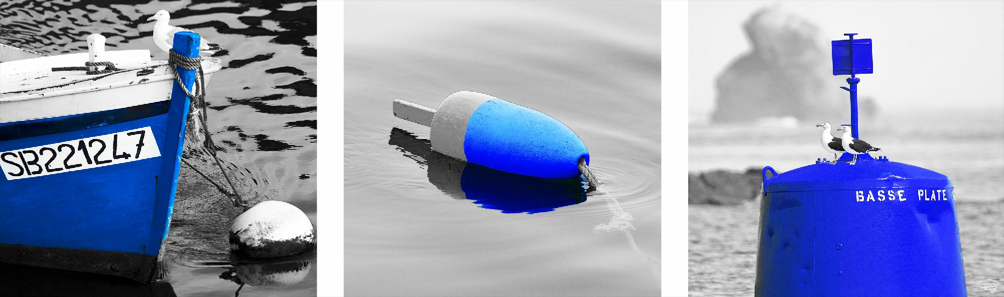 Une étrave de bateau, une bouée et une balise, avec une couleur commune : le bleu. Trois photographies avec le même univers et la même tonalité, pour une ambiance maritime et déco.