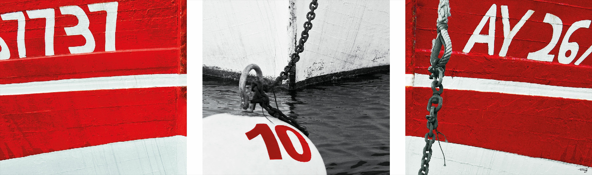 Mouillage, immatriculations de bateaux de pêche dans le port d'Auray, en Bretagne. Le blanc et le rouge sont les couleurs principales pour un véritable univers marin.