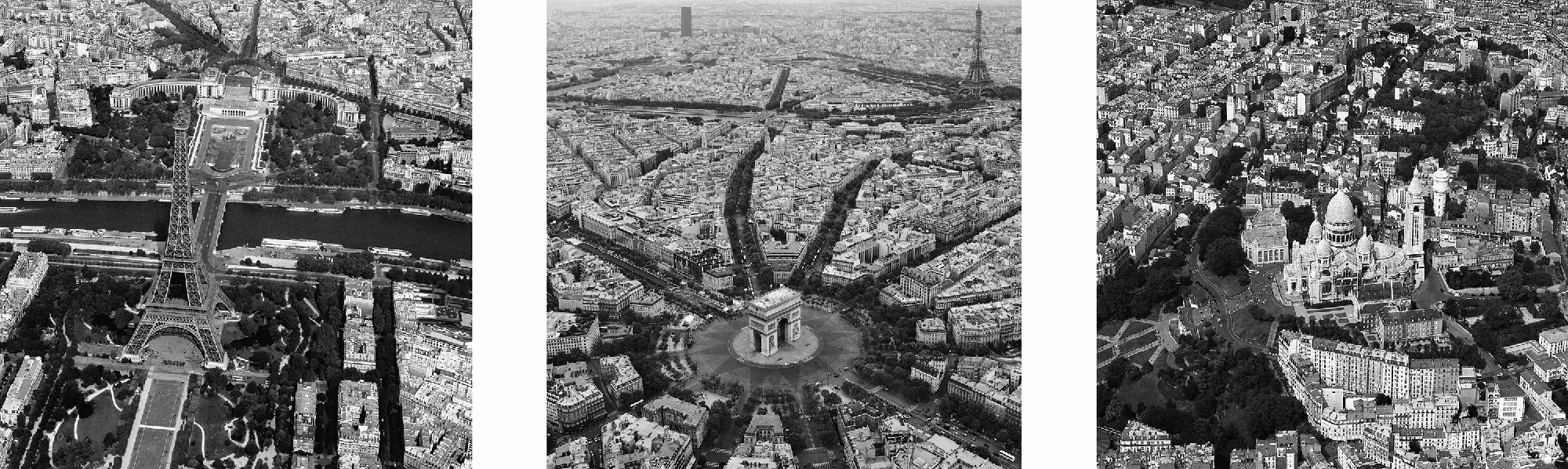 La Tour Eiffel, l'Arc de Triomphe et le Sacré-Coeur vus du ciel, en noir en blanc.