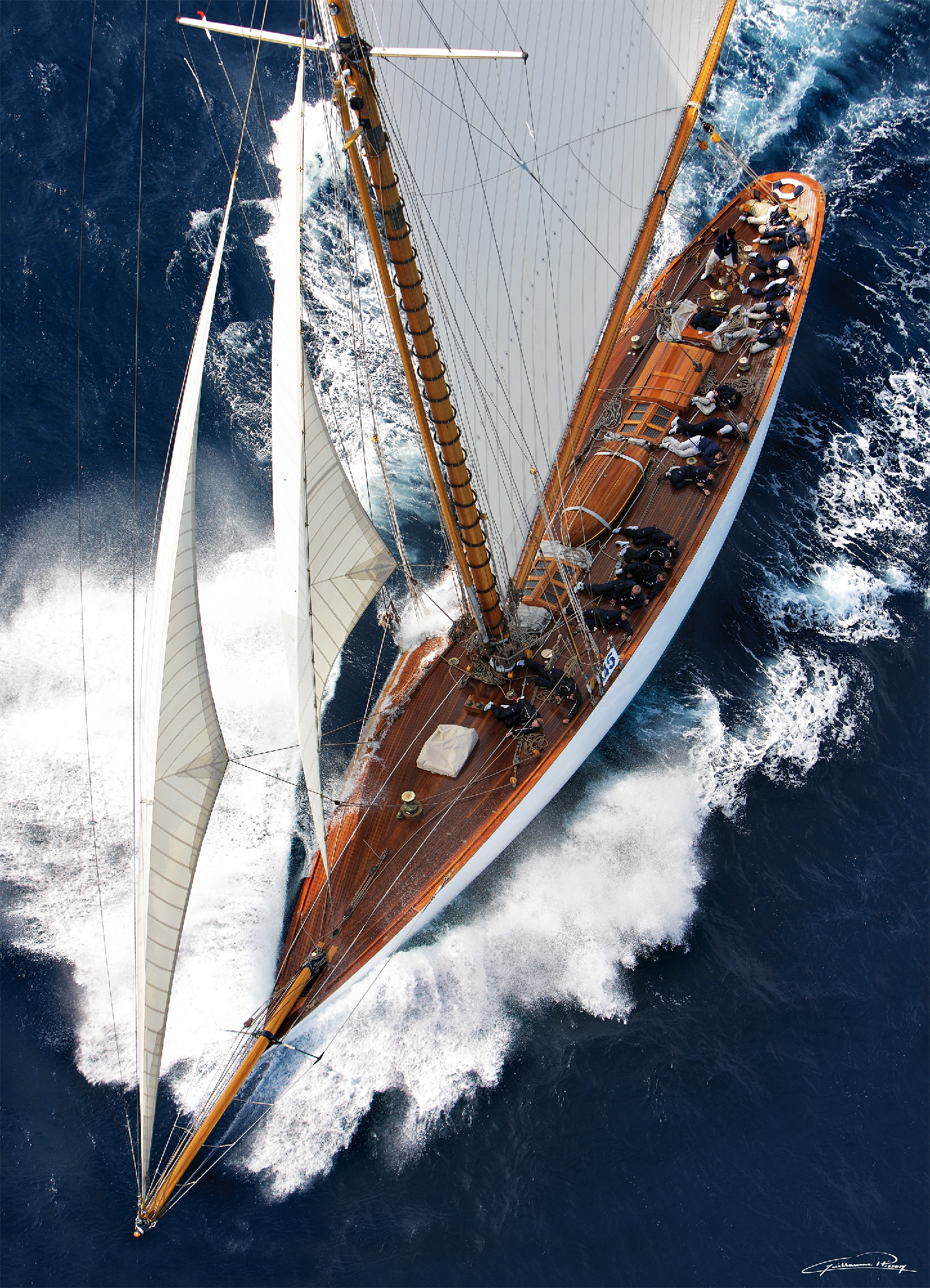 Le voilier Mariquita vu du ciel, pendant les régates des Voiles de Saint-Tropez. La ligne est parfaite, dessinée pour traverser les océans en toute sécurité et avec élégance !