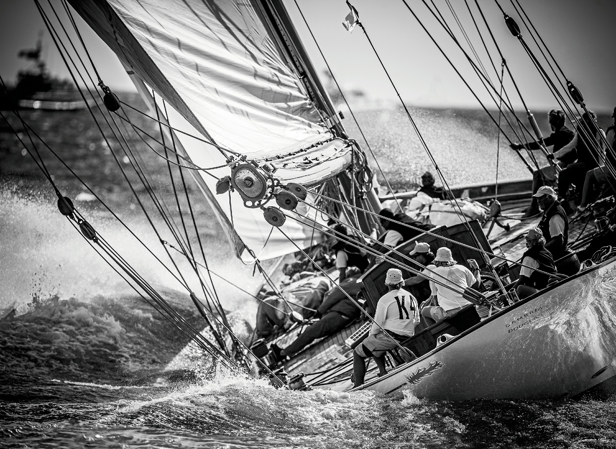 Dans la vague de Cambria, nous sommes presque à bord ! Admirez tous les détails de la coque, du pont, de la mâture, du gréement. Un chef d'oeuvre de l'architecture navale, pour le plaisir des yeux et de la performance.