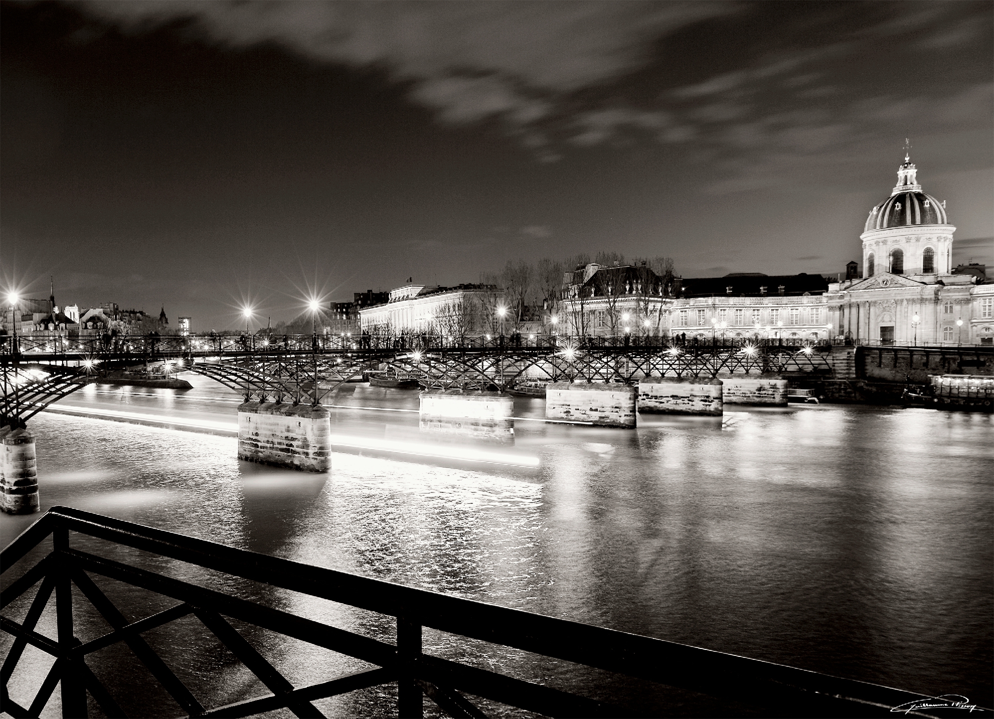 Le Pont des Arts, une nuit à Paris. La magie du noir et blanc, dans la ville lumière.