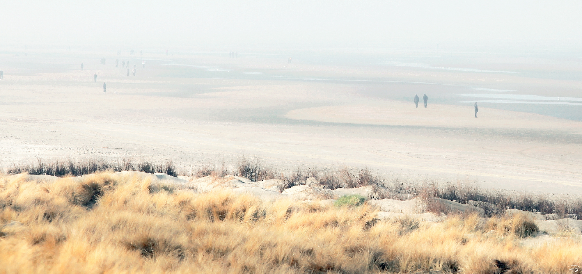La plage appartient aux promeneurs, que l'on distingue à peine dans la brume. Les grandes plages du Nord-Pas-de-Calais sont propices aux longues promenades dominicales entre dunes et océan.