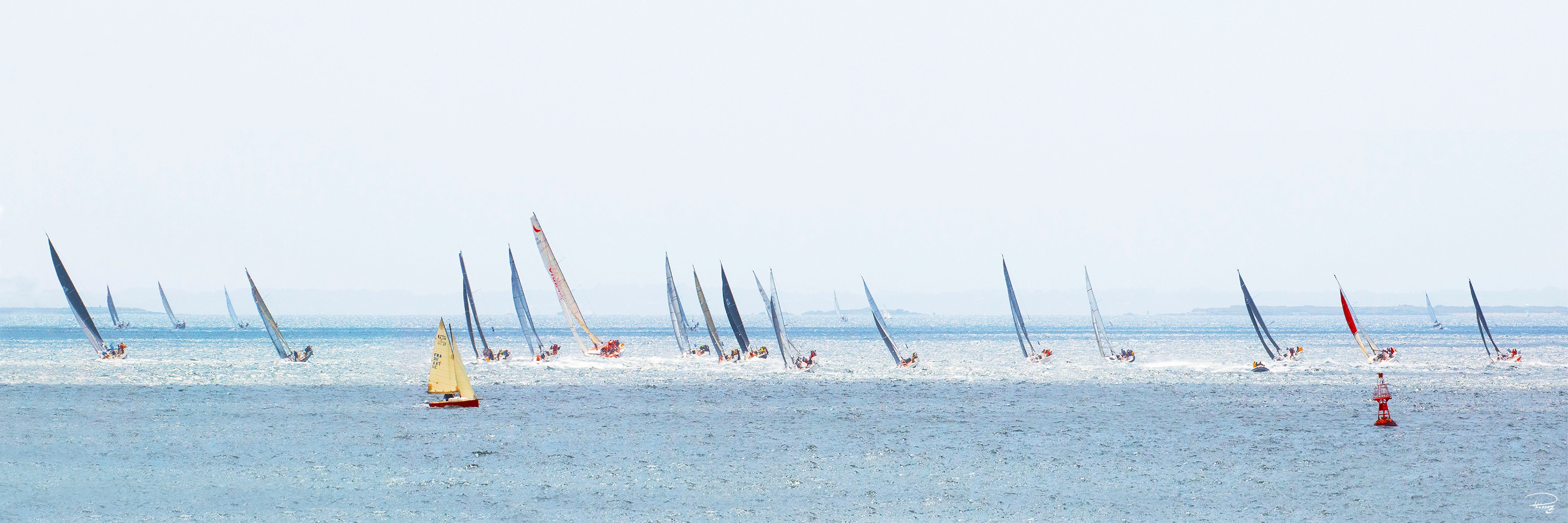 Les voiliers régatent en baie de Quiberon pendant le Spi Ouest-France. La mer est calme, le ciel bleu pâle et le soleil a réussi à mettre en lumière la ligne de départ des bateaux qui arborent leurs plus belles couleurs de voiles.