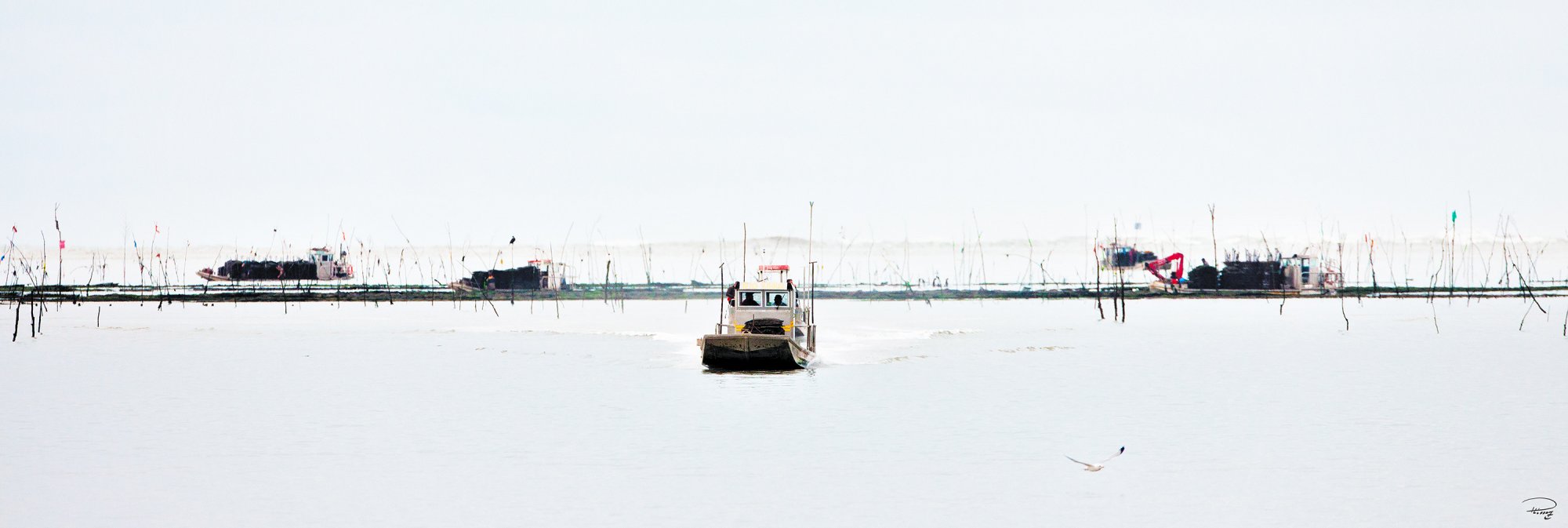 Le ponton ostréicole revient de la marée. Au second plan, on voit les tables d'élevage des huitres. L’ostréiculture est une activité maritime très importante en Bretagne sud, et le ballet des pontons fait partie du paysage breton. Leur départ le matin au petit jour, ou leur retour, chargés des sacs récoltés sur les tables, est toujours un spectacle apprécié par les promeneurs, ou photographes…