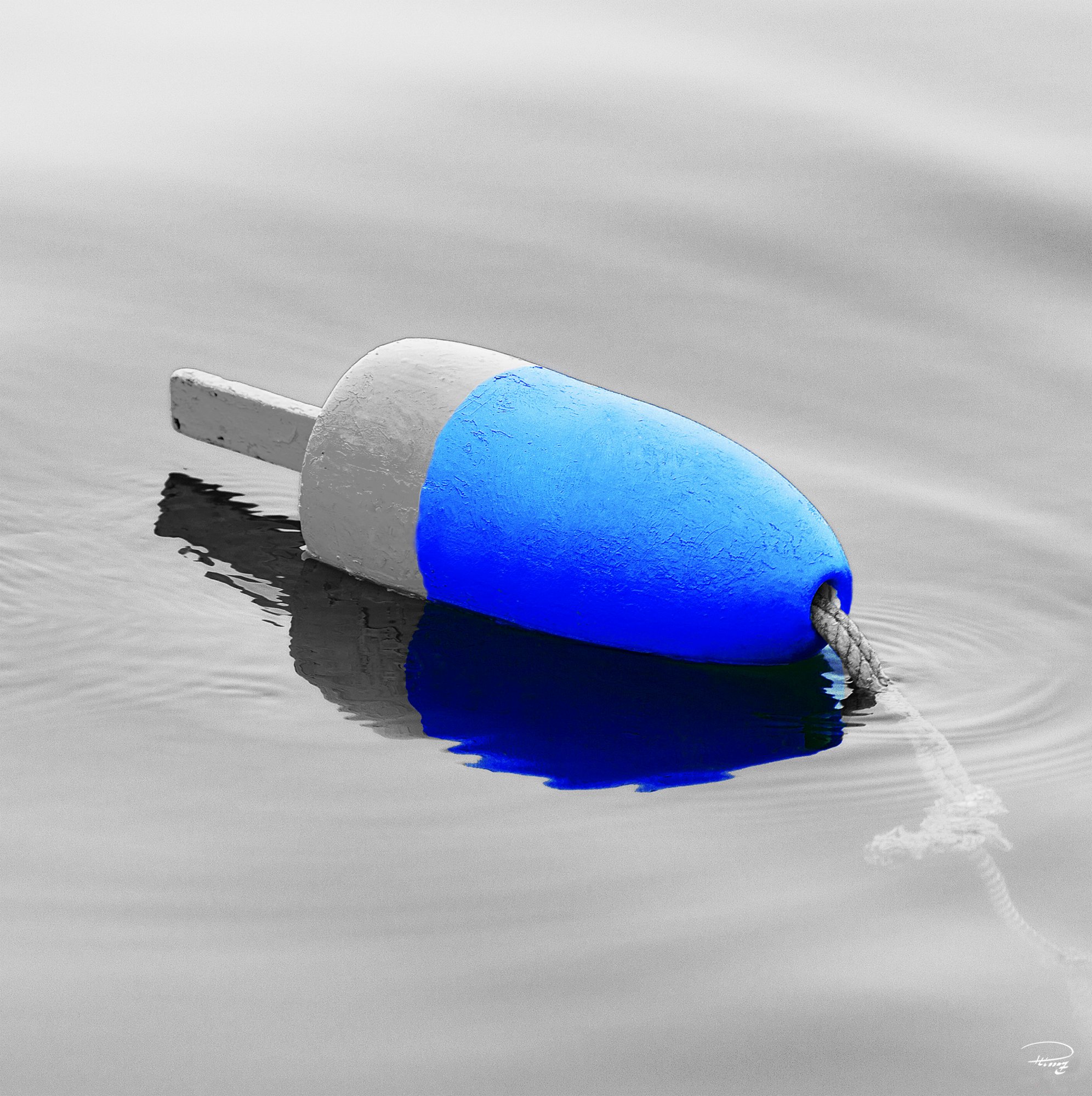Ces bouées multicolores de casiers à homards sont très utilisées sur la Côte Est américaine. Ici cette bouée bleue et grise se reflète dans la mer calme. Une photographie bord de mer, pour décorer vos murs.