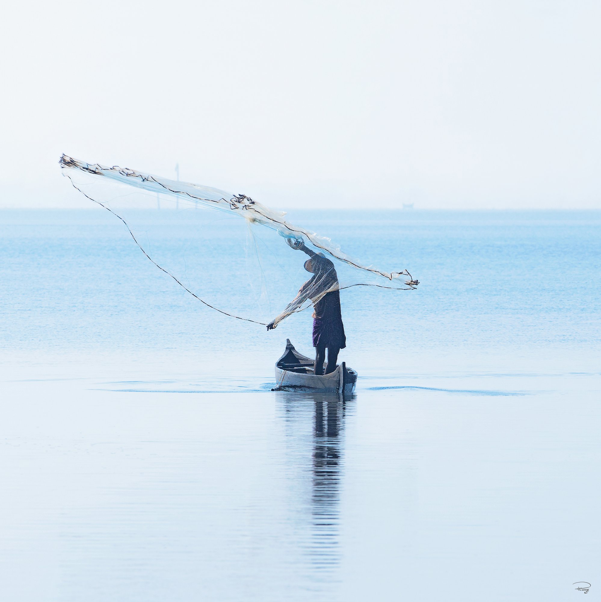 En Inde, le pêcheur à l'épervier lance son filet à la mer. Une photographie en mouvement, aux couleurs très douces pour décorer vos murs.
