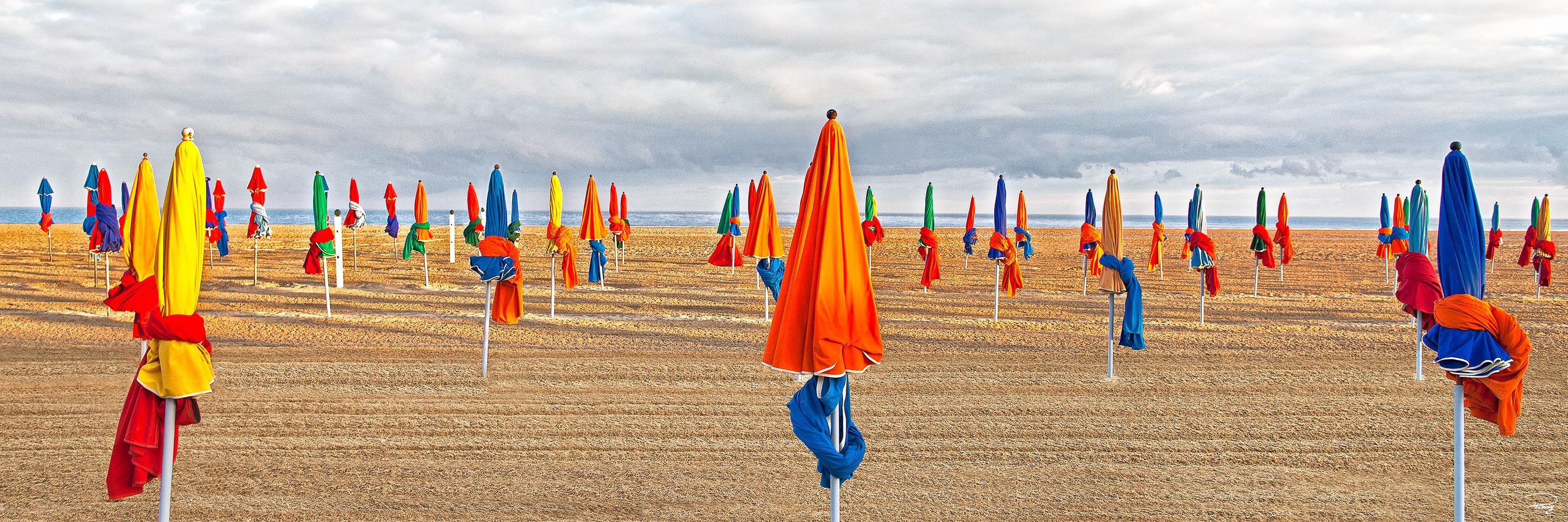 La plage de sable fin de Deauville, ses parasols colorés et sa célèbre promenade des planches.