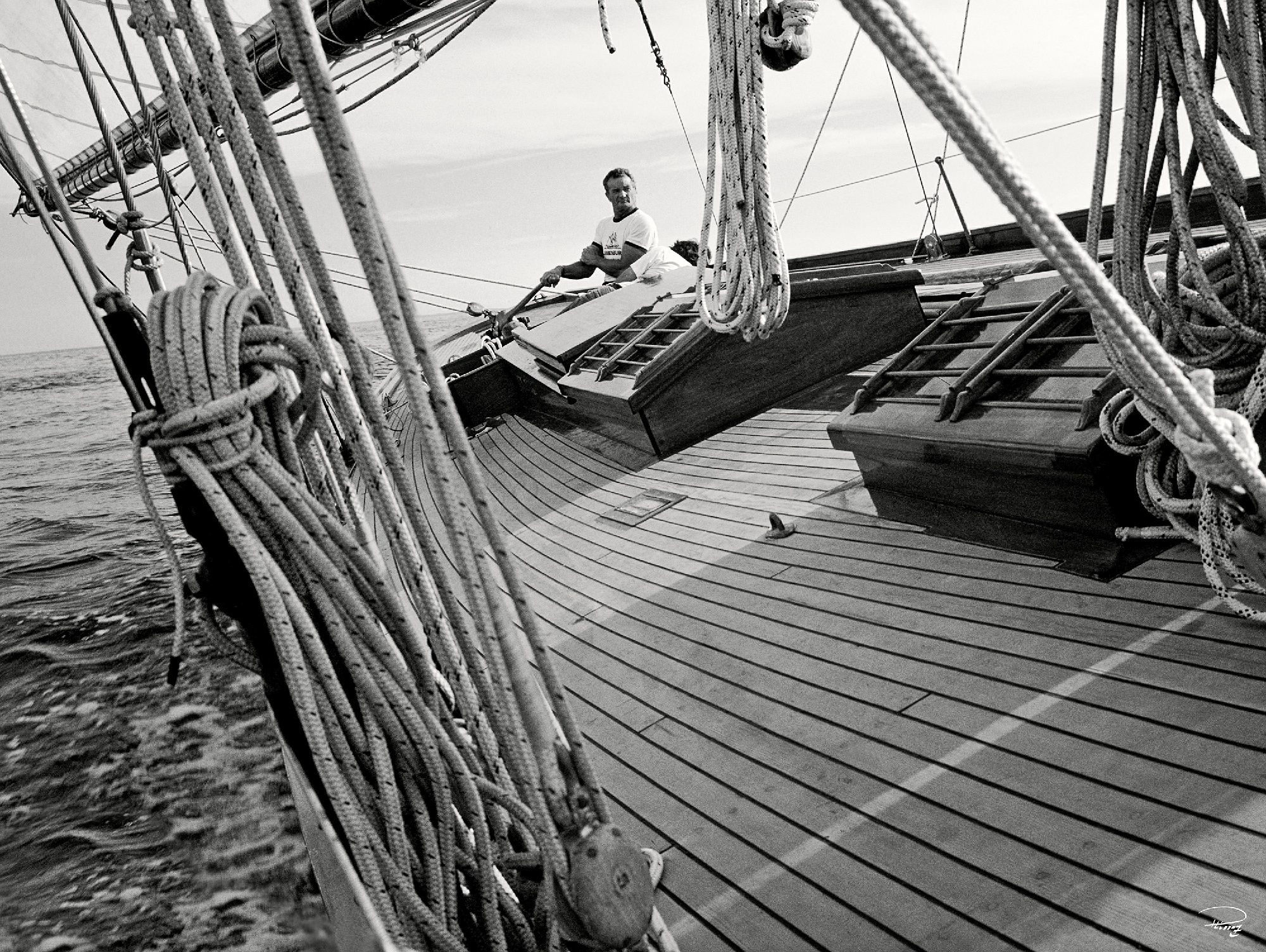 Cette photo, c’est le soir où nous rentrions d’un beau mouillage aux Glénan. On n’a pas besoin de parler avec Éric pour se comprendre. Nous savons l’un comme l’autre que ce bateau offre à celui qui sait l’écouter et le regarder avec le cœur une authentique relation avec la mer.