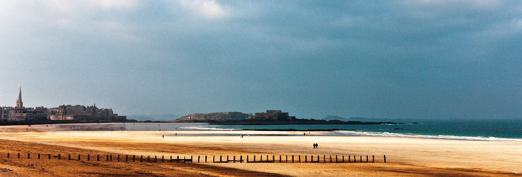 La longue plage du Sillon à Saint-Malo. On aperçoit au second plan la ville fortifiée. La plage du Sillon est célèbre pour ses pieux de bois servant à casser la houle lors des grands coefficients de marées.