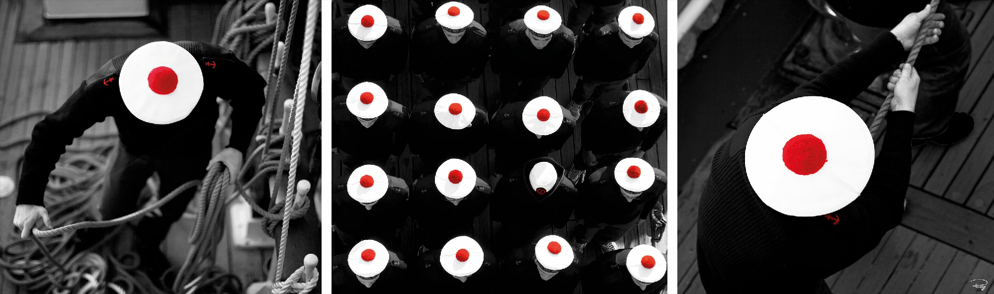 Apprentis matelots de la Marine nationale ici en formation sur le trois-mâts barque Belem. Les bérets à pompons rouges des élèves de l'Ecole Navale sur le pont du Belem.