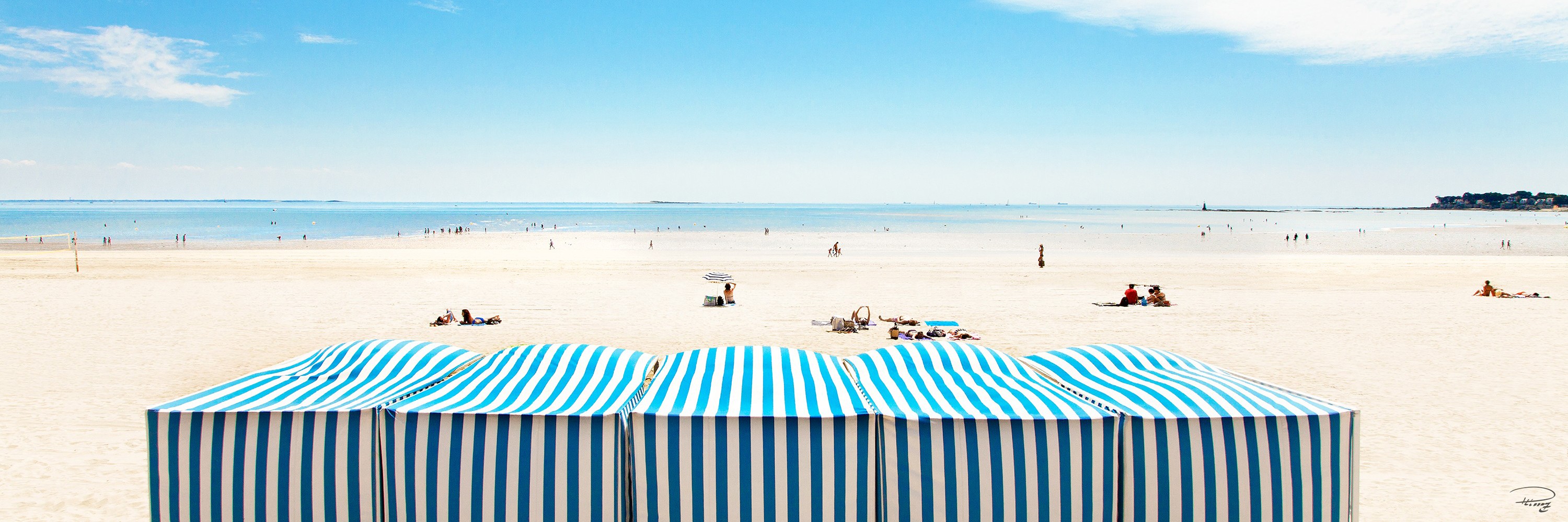 La grande plage de la Baule-Escoublac et ses cabines de plage. Pendant l’été, chacun peut se sentir un peu plus chez soi sous l’une des 750 tentes rayées bleu et blanc.