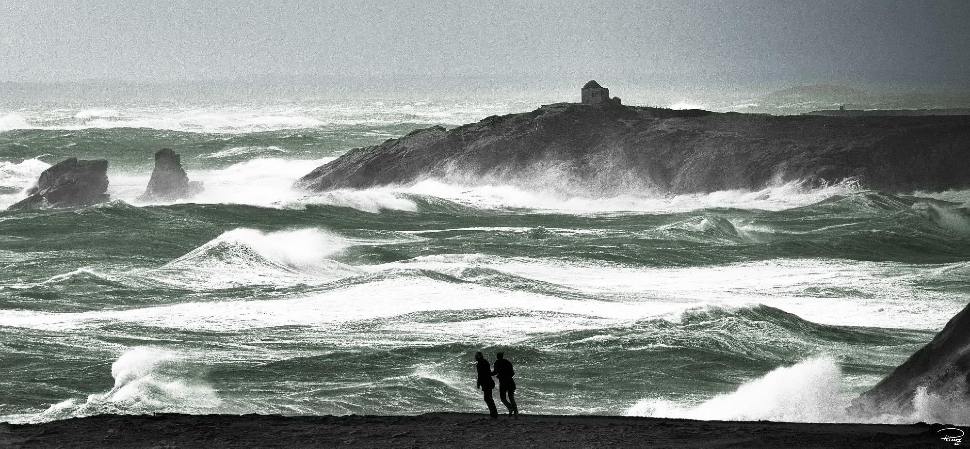 Coup de vent sur la Presqu'île de Quiberon en Bretagne, ici à la Pointe du Percho sur la côte sauvage, des promeneurs en quête de sensations fortes.