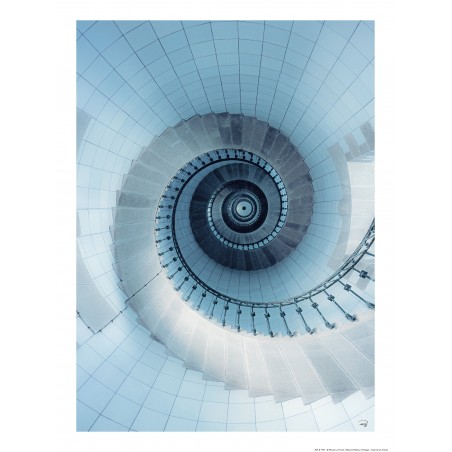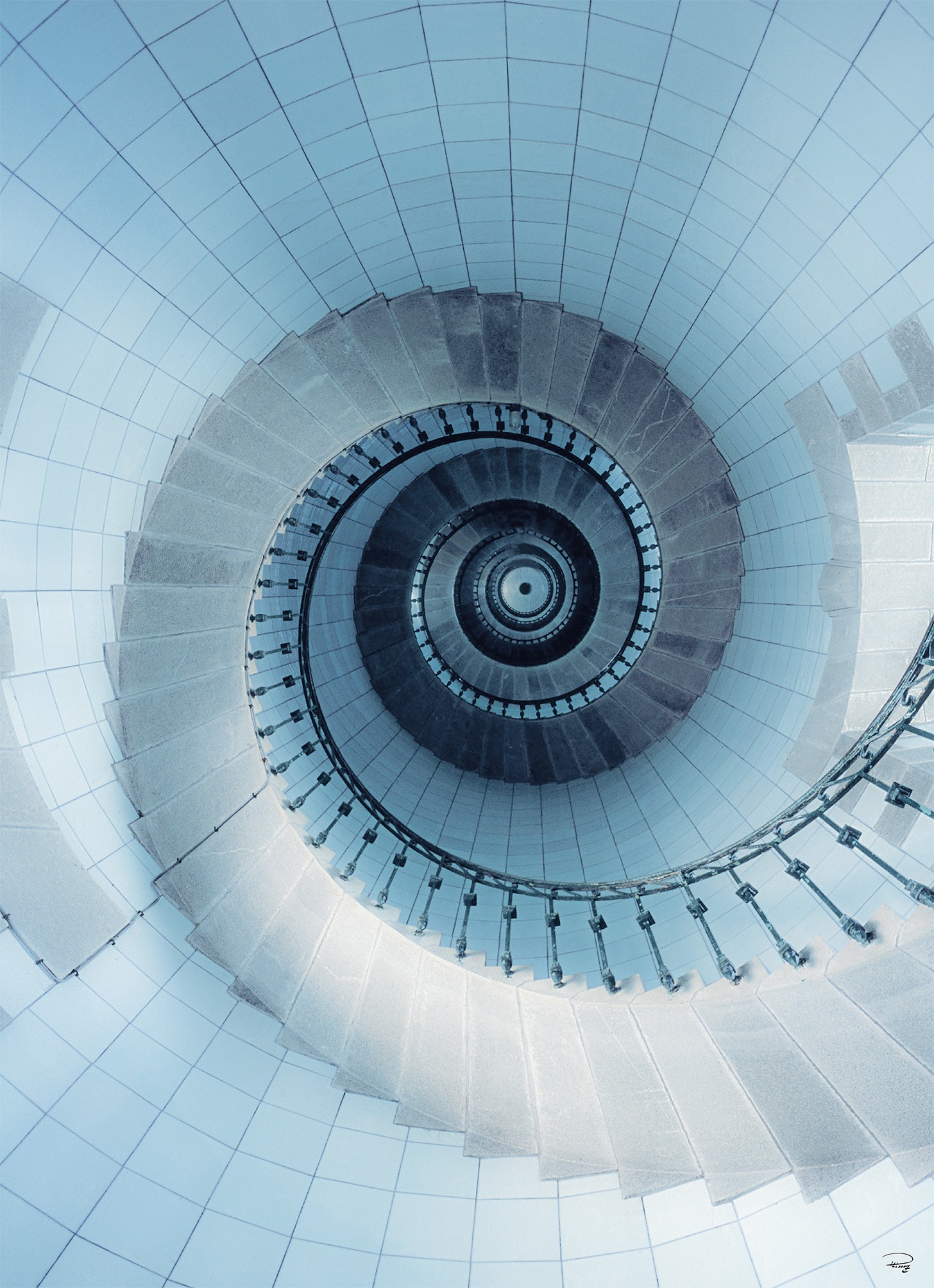 Les 360 marches suspendues, faites sur mesure en pierre de taille des escaliers du phare de l'île Vierge tournent à l'infini en montant vers la lentille. Une jolie photo graphique pour tous les amateurs de ces chefs d'oeuvre en péril.