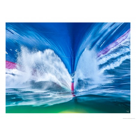 Derrière cette lame d'acier apparait une étrave bleue et rouge. La vague d'étrave se dessine et on ressent presque la déchirure de l'océan.
