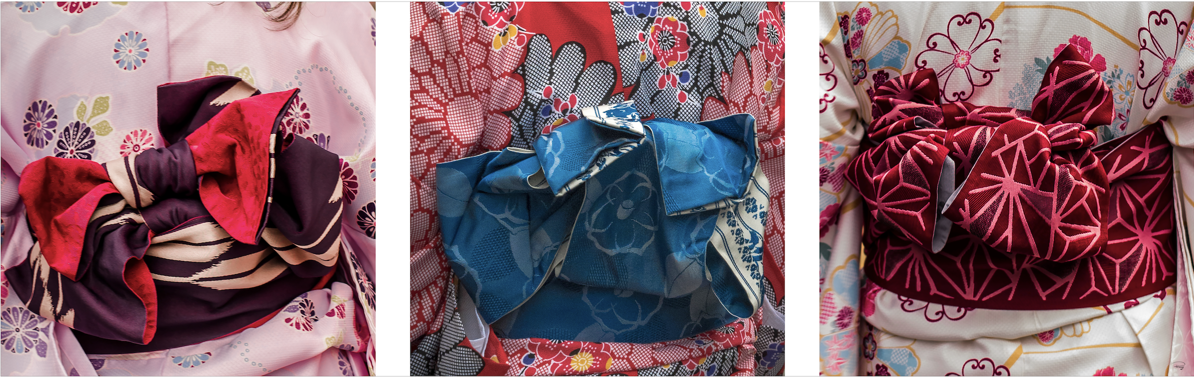 Afin de respecter les codes japonais, le kimono avec ceinture Obi se porte avec le noeud à l'arrière. De nos jours le kimono n'est porté que très rarement, et essentiellement lors des cérémonies officielles. Les ceintures Obi sont donc rares et les plus belles pièces coutent extrêmement cher. Si le Obi est encore porté, c'est donc avec un Yukata (vêtement japonais à coupe droite qui ressemble beaucoup à un kimono mais dans un tissu plus léger). Autrefois réservé aux bains et à la maison, le Yukata se porte désormais dans la rue et à l'occasion des festivals d'été.