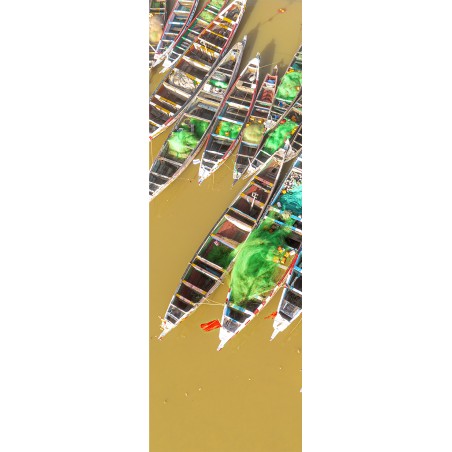 Toutes ces embarcations attendent leur prochain départ pour partir en pêche. Les filets colorés sont déjà à bord, le départ en pêche est imminent ! Une photographie pleine de couleurs pour vous dépayser et proposer une décoration murale à votre image : originale et dynamique.