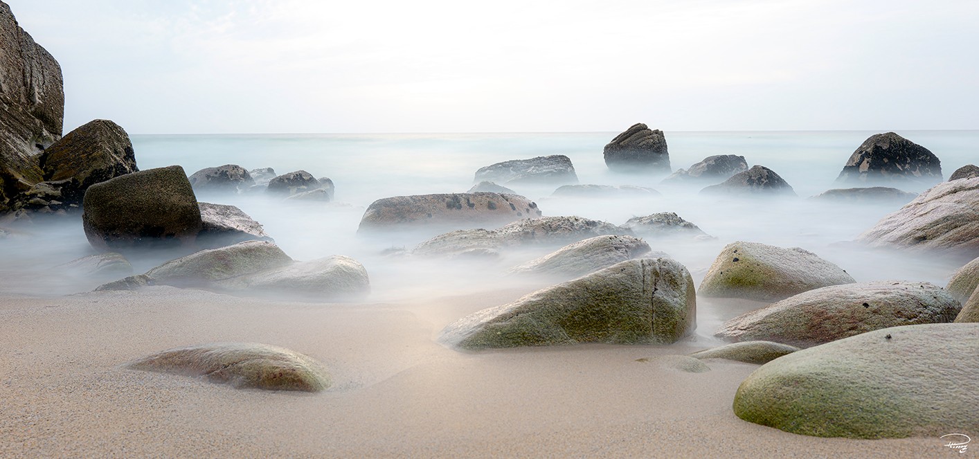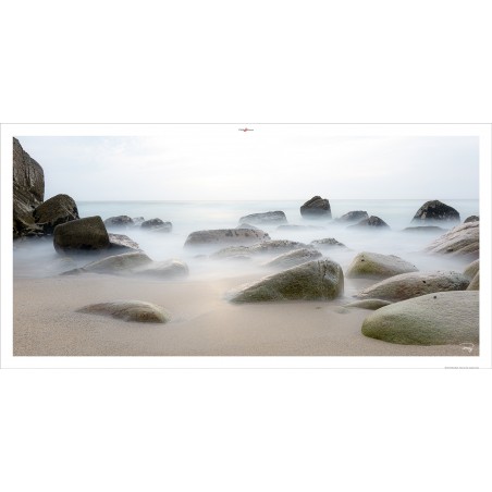 Toute la Féérie de la Bretagne est dans cette image. La brume mystérieuse, la plage, les rochers, et au loin... la mer. Vous pourrez accrocher cette photo à votre mur et laisser votre imagination faire le reste.