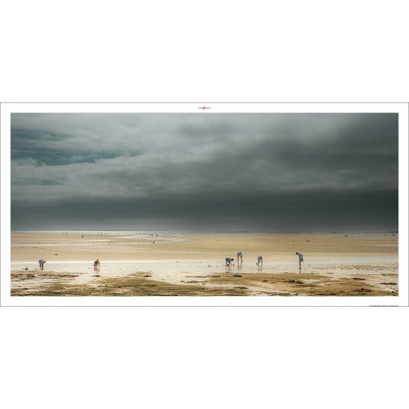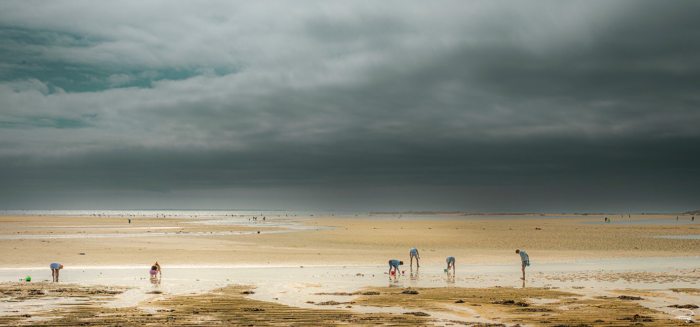 La lumière se pose sur l'estran où les pêcheurs à pieds profitent des derniers instants avant l'arrivée de la pluie. Cette image s'est construite comme un tableau : la marée basse et ses reflets amènent tout doucement vers l'horizon où la mer se confond avec le gris du ciel. Un joli moment pour les amateurs de pêche à pied, qui profitent de la douceur et de la tranquillité de la plage qui leur appartient.