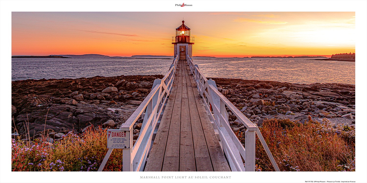 Le phare de Marshall Point balise l'entrée du port de Port-Clyde dans le Maine depuis 1832. Sa jolie tourelle est reliée à la terre par une petite passerelle en bois, où une maison de type néocolonial abrite le gardien. C'est le décor parfait pour une invitation au voyage entre ciel et mer. Dans la lumière dorée du soleil couchant, l'invitation au voyage est encore plus tentante !