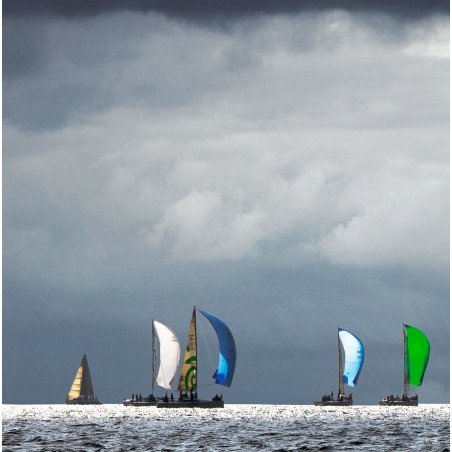 The winter regattas in the Morbihan, in La Trinité-sur-Mer are highly appreciated by sailing enthusiasts. The colorful sails stand out with the grey sky and the lights on the sailboats. A real sailing and seaside photograph by Philip Plisson.