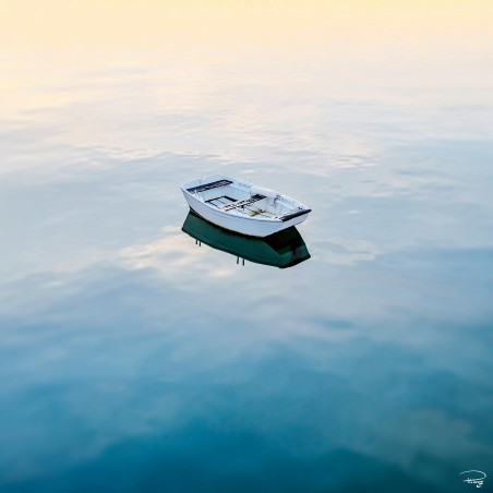 This little boat is anchored to his buoy on the calm water. In the early morning light, the sea reflects the soft colors of the sky in a pretty shade of blue. This photograph inspires the calm and serenity that will decorate your home.