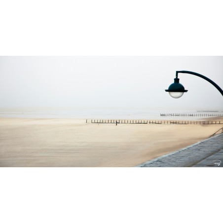 The Sillon beach in Saint-Malo at dawn in the autumn mist. There is nobody, or almost nobody, on the beach at this time. The sky is low, the sand has been swept away by the tide, and the beach is waiting for all the autumn lovers to come for a walk...