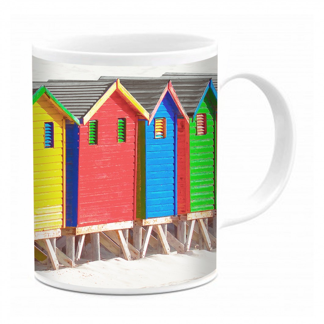 The colourful huts on Muizenberg beach, near Cape Town in South Africa, are lined up on the white sand. This photograph is printed on a ceramic mug, and sold in a pretty cardboard box.