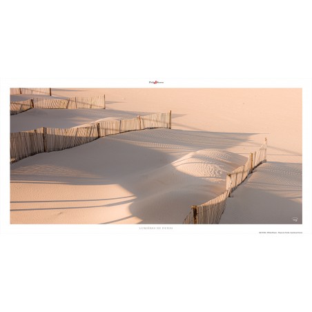 The sun plays with the wooden sand fences and draws shadows on the sand. With its rounded shapes, waves of sand, shadows and light, the beach becomes a beautiful decor to decorate your walls with seaside colours.